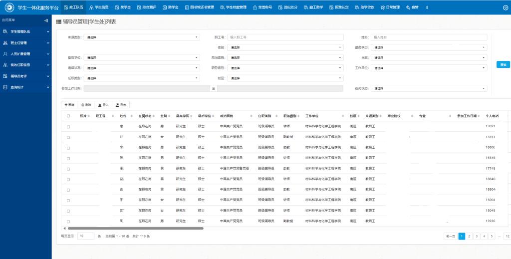 学生一体化管理与服务平台包括政工队伍、学生信息、奖助学金、综合测评、违纪处分、勤工助学、“一站式”学生社区等18个功能模块,开通线上服务108项,功能涵盖迎新、毕业生离校、宿舍管理、心理健康教育、学风建设等业务流程,逐步实现“让数据多跑路,让学生少跑腿”的目标,夯实了“一网通办”的学生管理服务基础,更有效地赋能学生个性化需求和多元化成长。