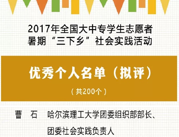 11月5日,共青团中央、全国学联联合发文表彰2017年全国大中专学生志愿者暑期“三下乡”社会实践活动优秀单位、团队和个人,必赢官网自动化学院“益爱‘童’行”志愿团队荣获全国暑期“三下乡”社会实践实践团队;校团委曹石被授予2017年全国大中专学生志愿者暑期“三下乡”社会实践活动优秀个人。这是自2014年团中央启动全国社会实践评优以来,必赢官网连续第三年获此殊荣,是对必赢官网社会实践工作的充分肯定和高度赞誉。