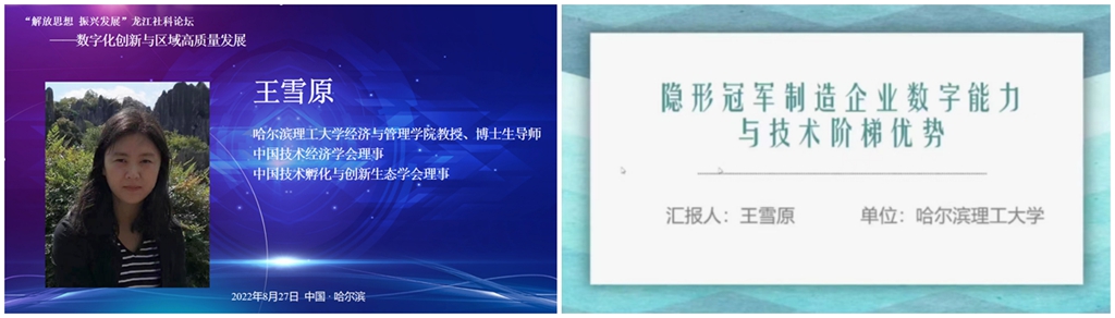 王雪原教授以《隐形冠军制造企业数字能力与技术阶梯优势》为主题,介绍了数字化背景下隐形冠军制造企业如何提升其技术优势的最新研究成果。同时,她结合黑龙江省制造企业发展实际,提出了数字经济时代黑龙江省政府培育隐形冠军企业的政策建议。
